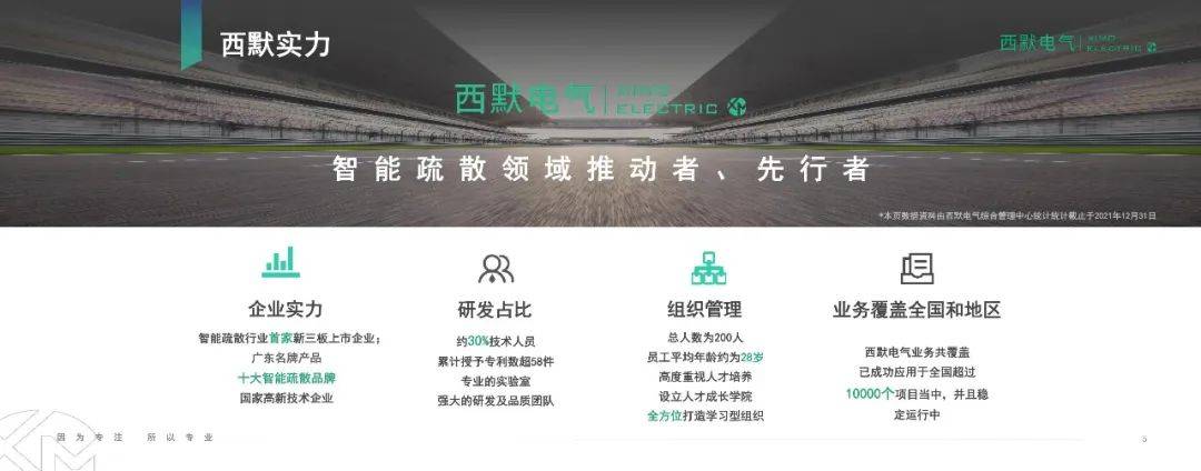 西默电气品牌实力是通过十几年的沉淀的。企业方面,我们是国内专门做智能疏散指示系统、行业内挂牌新三板的企业,是连续多年都是在各大平台、受到各位专家领导寄予的认可;在系统和产品稳定性方面,投入也逐渐地加大,这也能够为我们未来的产品发展提供更优质的创新和输出;组织管理方面,目前规模大概是200多人的企业规模;业务覆盖方面,我们主要是做国内的公建项目,所以这一块我们也是希望为整个的建筑行业、消防行业可提供我们西默的力量。