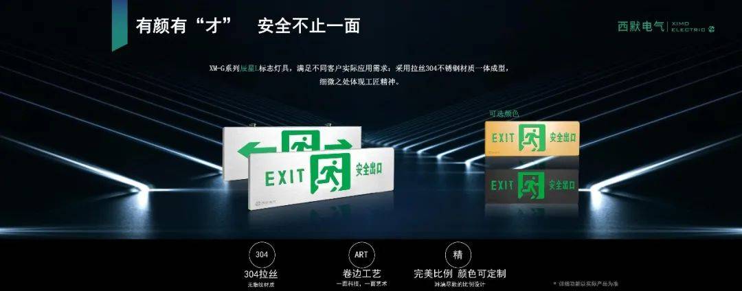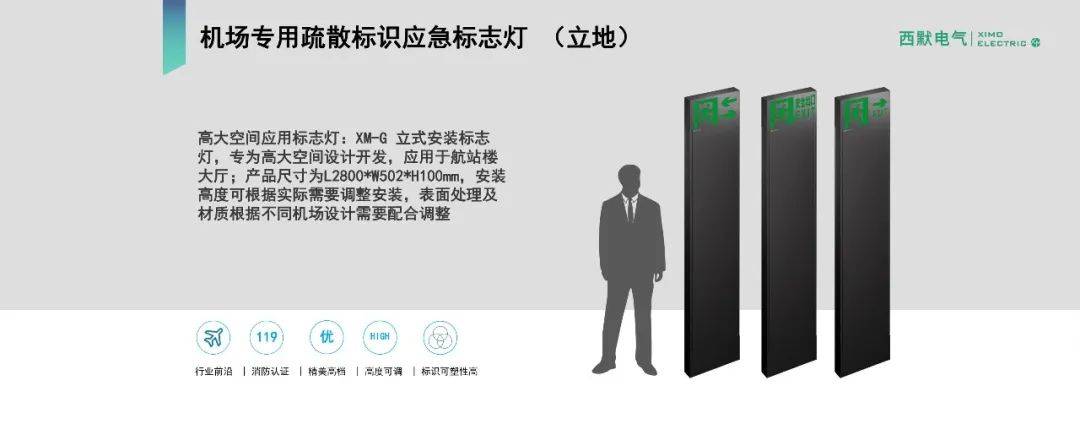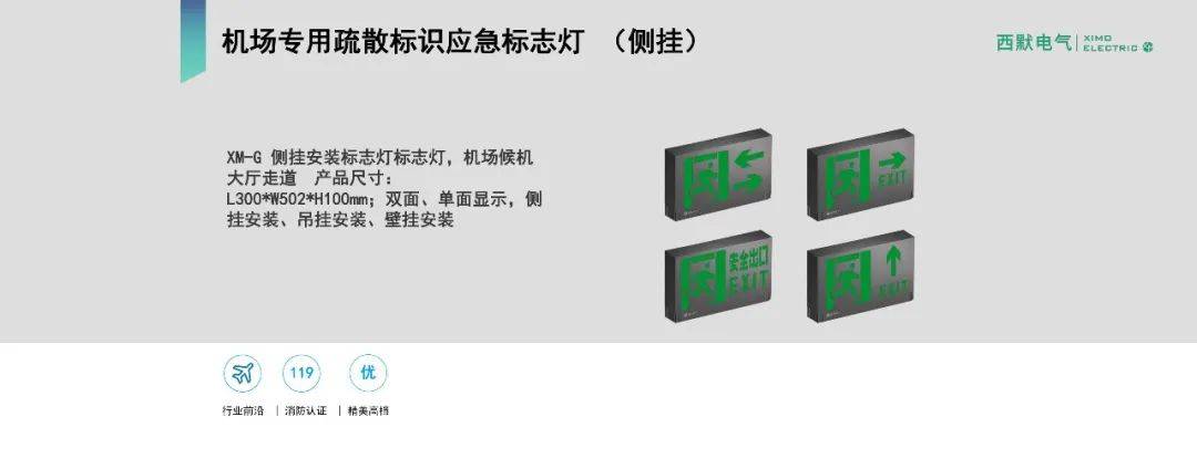 第二个应用场景就是机场,特别是大型的一些航站楼的应用,我们也重点去考虑到,这种应用场景它是需要高大空间的安装需求,所以我们做了高大空间的疏散指示灯具来配合这种应用场景,提供这种产品的应用可能,有绿色的疏散指示灯具,配合现场指引安装指引满足现场的应用需求,还包括大型侧挂式的灯具。