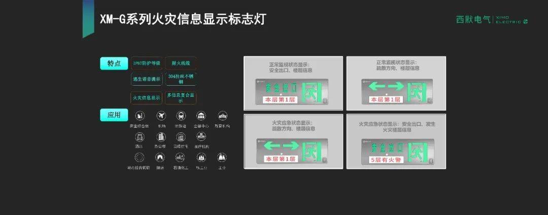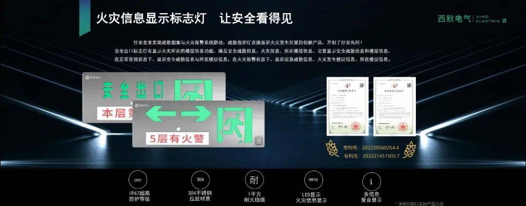 第三个创新点就是带火灾信息数据显示的灯具,这一块可能更多的、是在应用层面能体现的越来越明显,就是我们在安装完疏散灯具的情况下,根据现场的火灾情况做显示楼层信息,不至于让在现场的人员盲目地逃生,这样的话可以安抚很多特别是在紧急状况下的人员情绪。所以平时可以显示我们的楼层,应急情况下可以显示几楼火警、哪区域有火警。