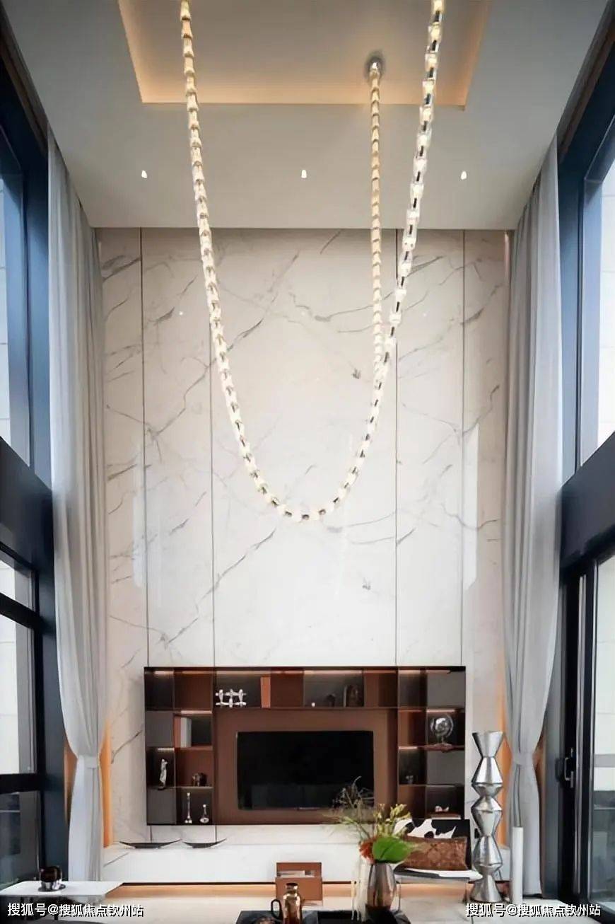 客餐厅一体空间,约6.4米开间,约7米挑高的客厅,标准奢阔,是待客的宗族门面,也是全家人相聚的交际场景。