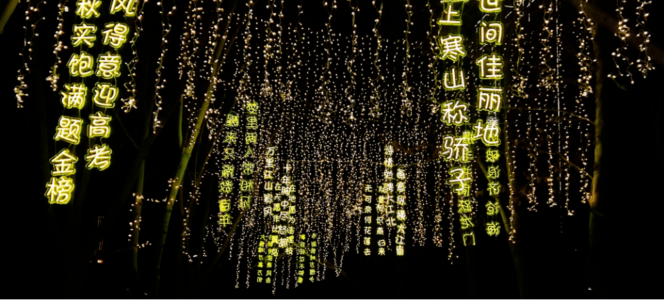 1月15日,库尔勒市孔雀河畔帆船广场打造的200条挂树发光诗词及1500条发光诗词配套挂树灯串缀满枝头,行走其间宛如进入时光隧道,斑斓光影,一步一诗,品尝诗词灯光里梨城的浪漫。