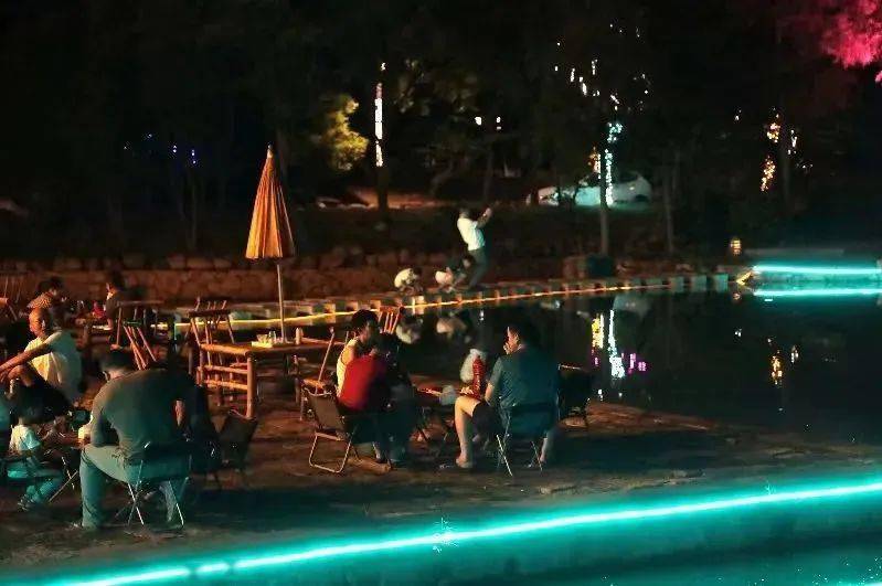 夜晚的小蕉村,一池清水静置中心,一片绚烂任意铺展。在这之中,除了前来夜游参观的周边市民,还不乏一些乡民悠然自得的身影,无论是纳凉谈天,仍是健身运动,每一个人都在这儿寻得一隅六合,享受着晚间的空闲韶光。