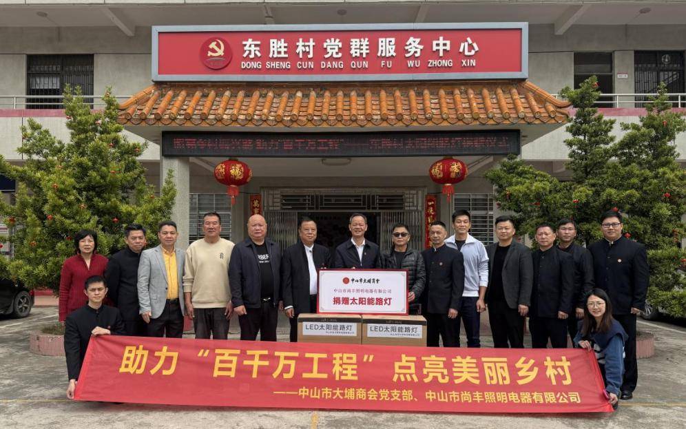 3月8日上午,中山市大埔商会、中山市尚丰照明电器有限公司把一批太阳能路灯送到东胜村。